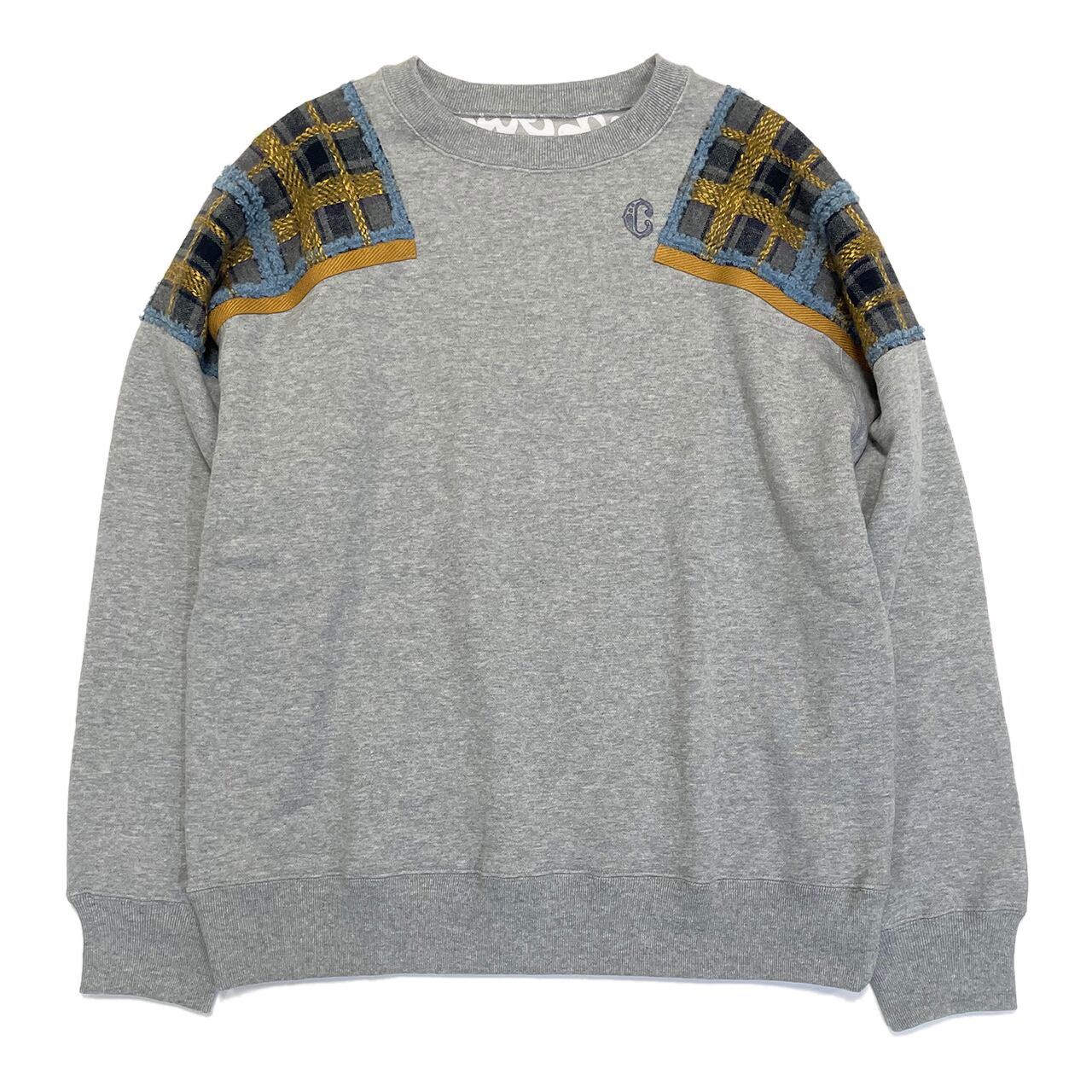 ループ糸を使用したモコモコ感のあるチェック生地を肩周りにパッチしたクルーネックスウェットです。