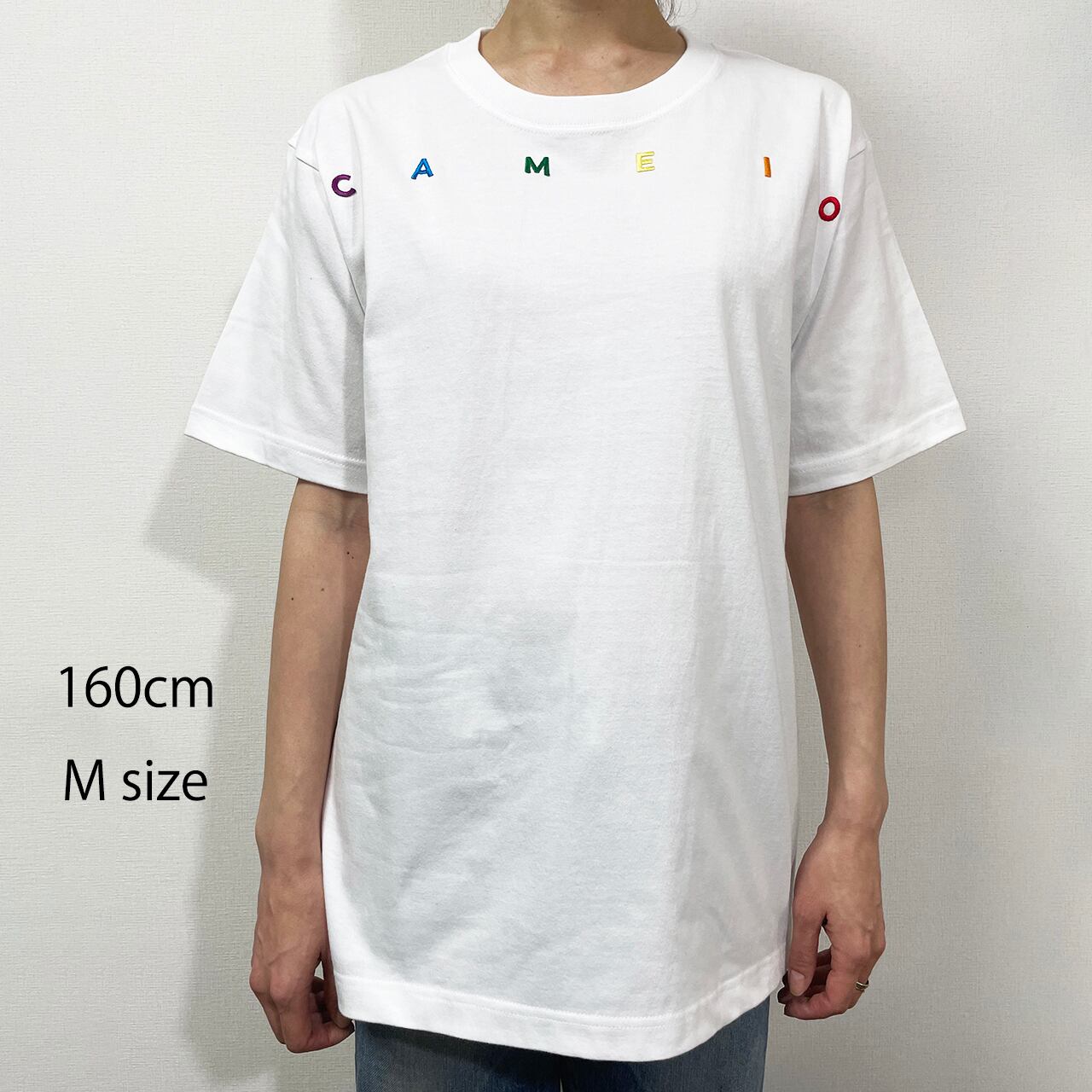 ブランド名「CAMEIO」のアルファベットの刺繍ワッペンを、レインボーカラーで胸元に配置したTシャツです。