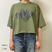 カリグラフィー風にデザインされたブランド名のプリントの上から、ブドウやレモンのフルーツを線描で表現した柄を重ねてプリントしたビッグシルエットのクロップドTシャツです。
